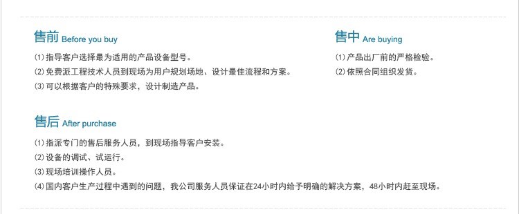 2.售后服務(wù)檔案化:顧客所購(gòu)的生產(chǎn)設(shè)備安裝調(diào)試后,所有相關(guān)信息將進(jìn)入專項(xiàng)檔案服務(wù)管理系統(tǒng),使用運(yùn)轉(zhuǎn)情況會(huì)及時(shí)受到我公司的關(guān)注,具有快捷及時(shí)的服務(wù)及定期回訪程序。