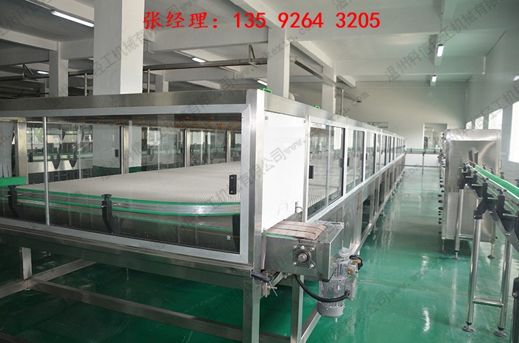 由輸送帶傳送過來的包裝瓶在設(shè)備入口處排瓶,順序進(jìn)入溫區(qū)預(yù)升溫85°C,然后進(jìn)入第二溫區(qū)滅菌溫15分鐘,第三和四、五溫區(qū)逐漸降溫,在出口部分設(shè)有凈水噴淋,出口溫度達(dá)到35℃。
