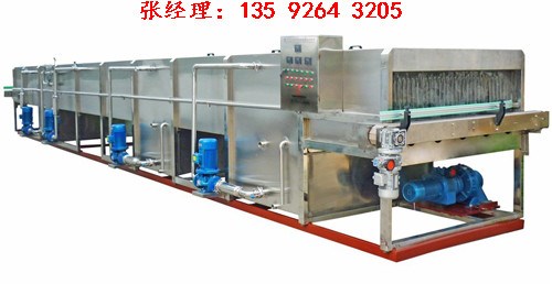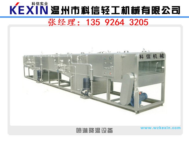 溫瓶機用于耐熱聚酯瓶茶飲料、熱灌裝、聚酯瓶碳酸飲料灌裝生產(chǎn)線,可使高溫灌裝的茶飲料降溫至36-40℃,低溫灌裝的碳酸飲料升溫至36-40℃,去除聚酯瓶表面的凝結(jié)水,保持瓶身干燥清潔,便于瓶裝線后的貼標(biāo)、裝箱作業(yè)。產(chǎn)量5000-20000瓶/小時,噴淋時間約15-20分鐘。連續(xù)噴淋式滅菌機是在吸收、消化國外樣機的礎(chǔ)上設(shè)計而成。采用循環(huán)溫水預(yù)熱、循環(huán)熱水滅菌、循環(huán)溫水預(yù)冷,再用冷卻水噴淋冷卻,四段處理形式;具有滅菌溫度自動控制,滅菌時間無級可調(diào)等優(yōu)點,能廣泛應(yīng)用于各種瓶裝、罐裝酸性果汁飲料、電解質(zhì)飲料、類、調(diào)味品等產(chǎn)品的滅菌冷卻。本設(shè)備可根據(jù)用戶提出的滅菌條件及產(chǎn)量要求進行設(shè)計。